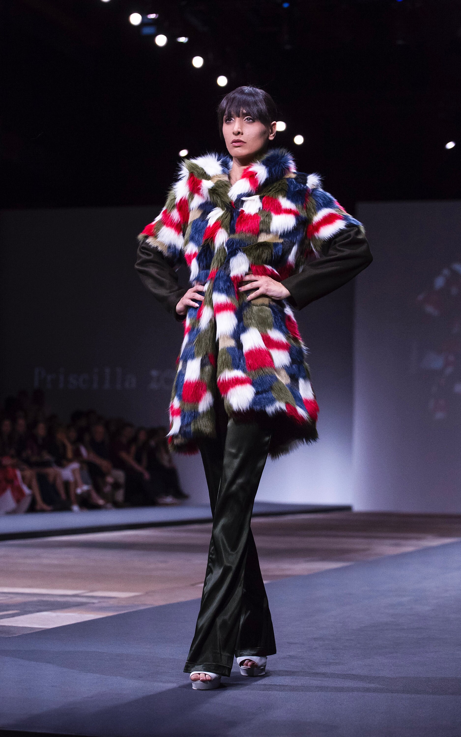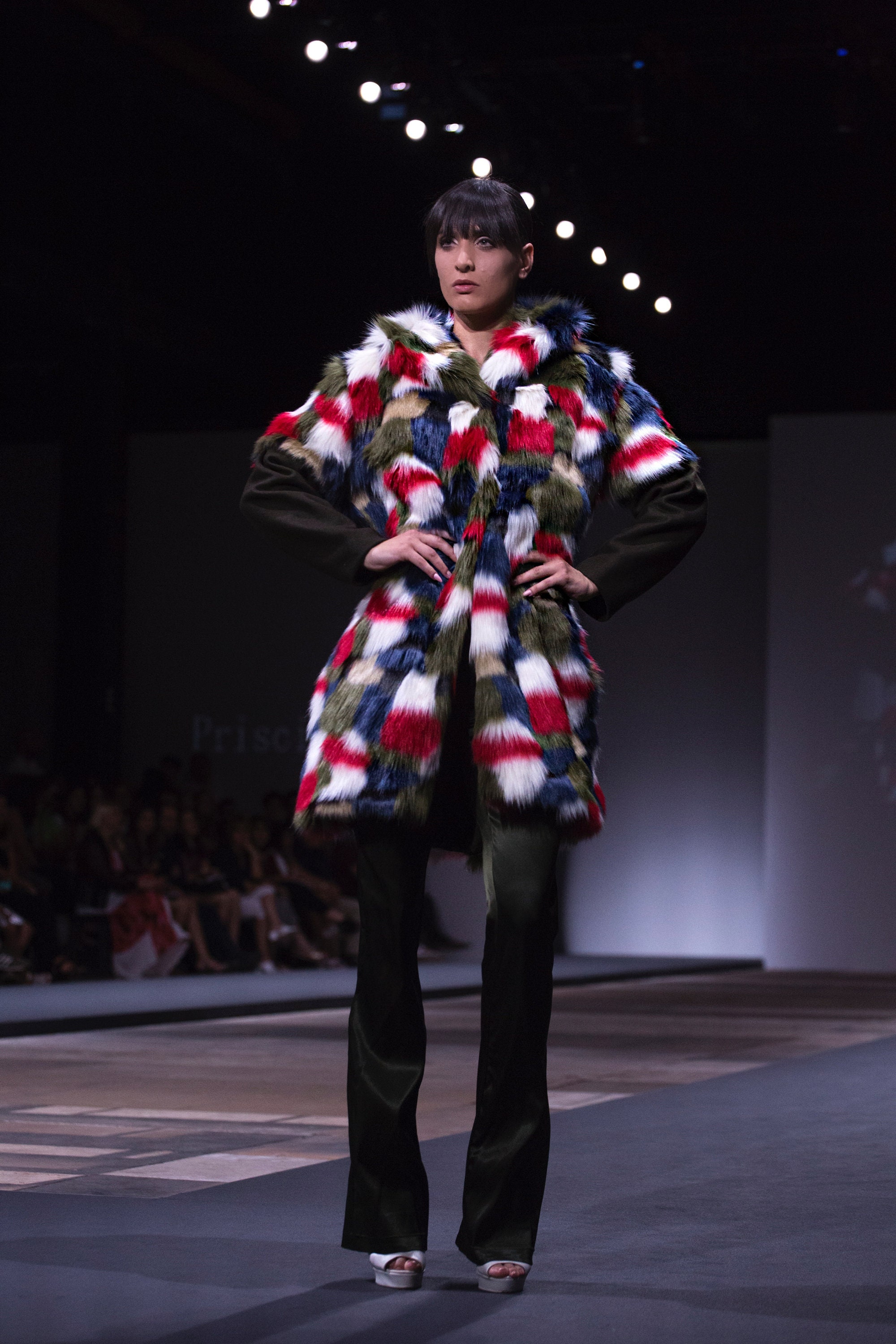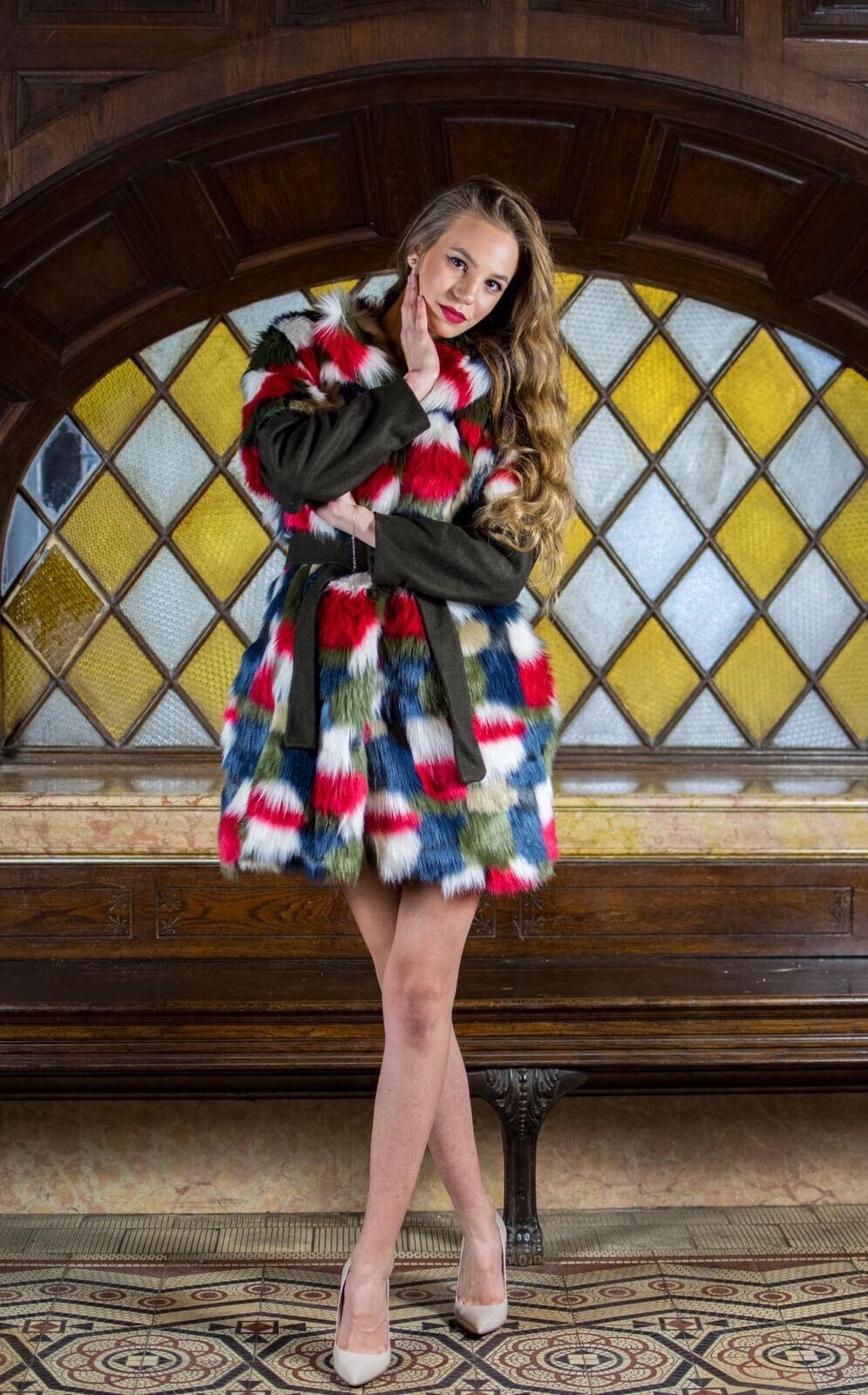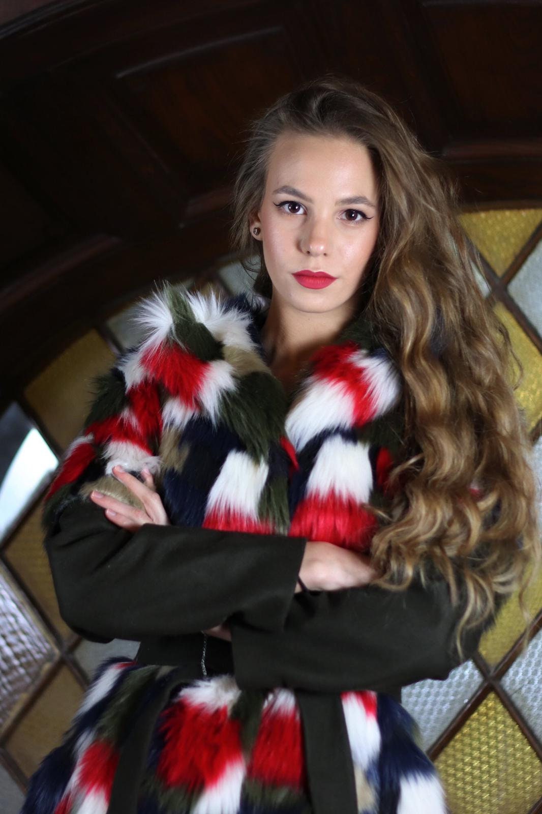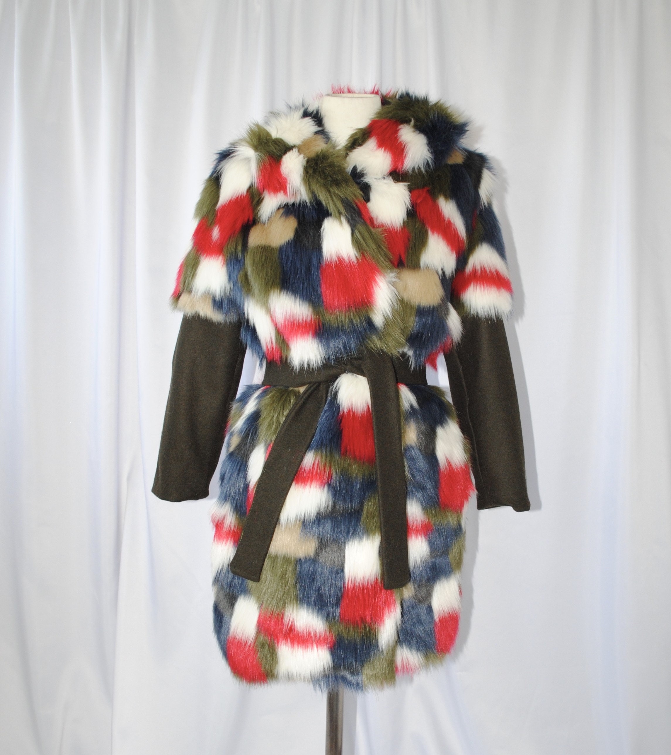 Multicolored faux fur coat with snap button closure and belt. Fits both sizes S and M.